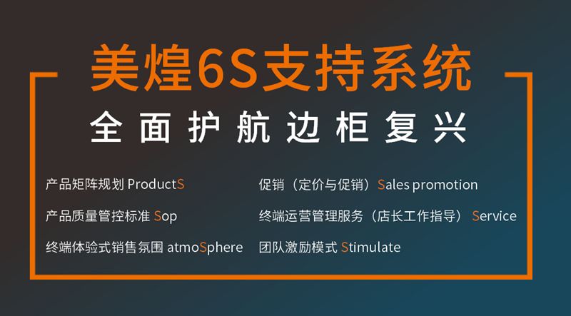 美煌边柜复兴不是打造爆品,不是简单的推广方案,也不只是打造产品,它是立体式、系统式、一站式的系统方案,为终端饼店提供6S系统支持,360度服务饼店,提升饼店销量和利润!